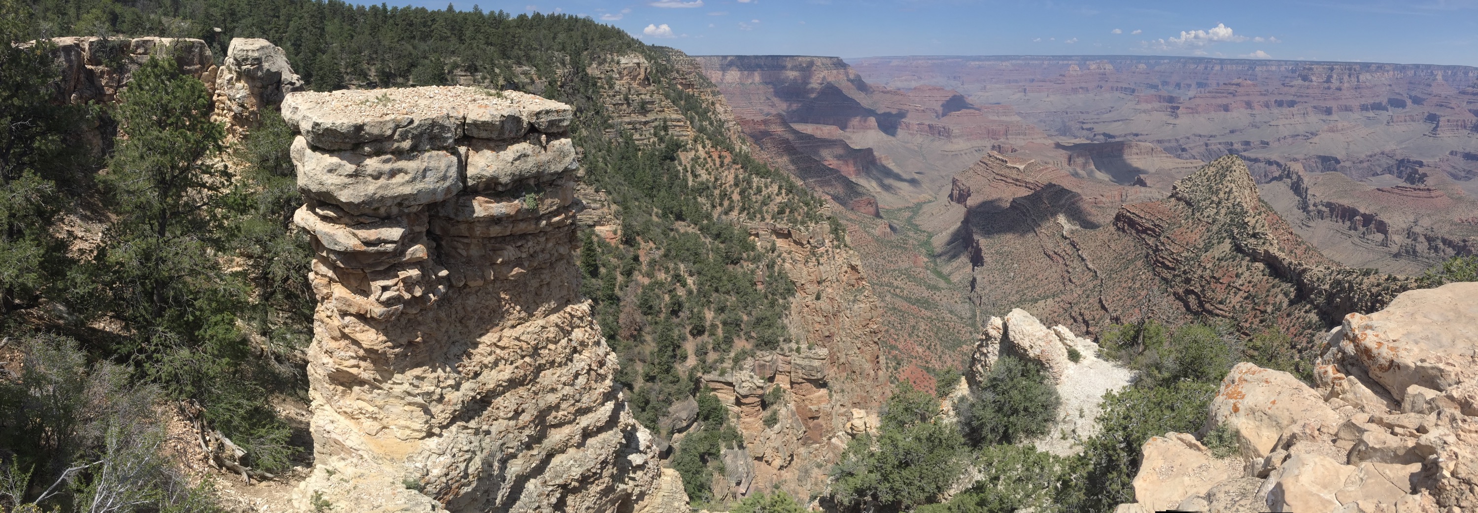 The Grand Canyon is a hard park to describe. We got in around 9AM Pacific, after driving though terrain that essentially looked like the alps. Pine forests, green mountains (even saw some ice on a couple) and winding roads. In my mind I had always envisioned the canyon in the middle of a desert, or perhaps surrounded by the same mesas we saw on the border of Arizona; but no, it was concealed entirely by forests, you’d have no idea it was there except for the unbelievable and very sudden rise in tourists.