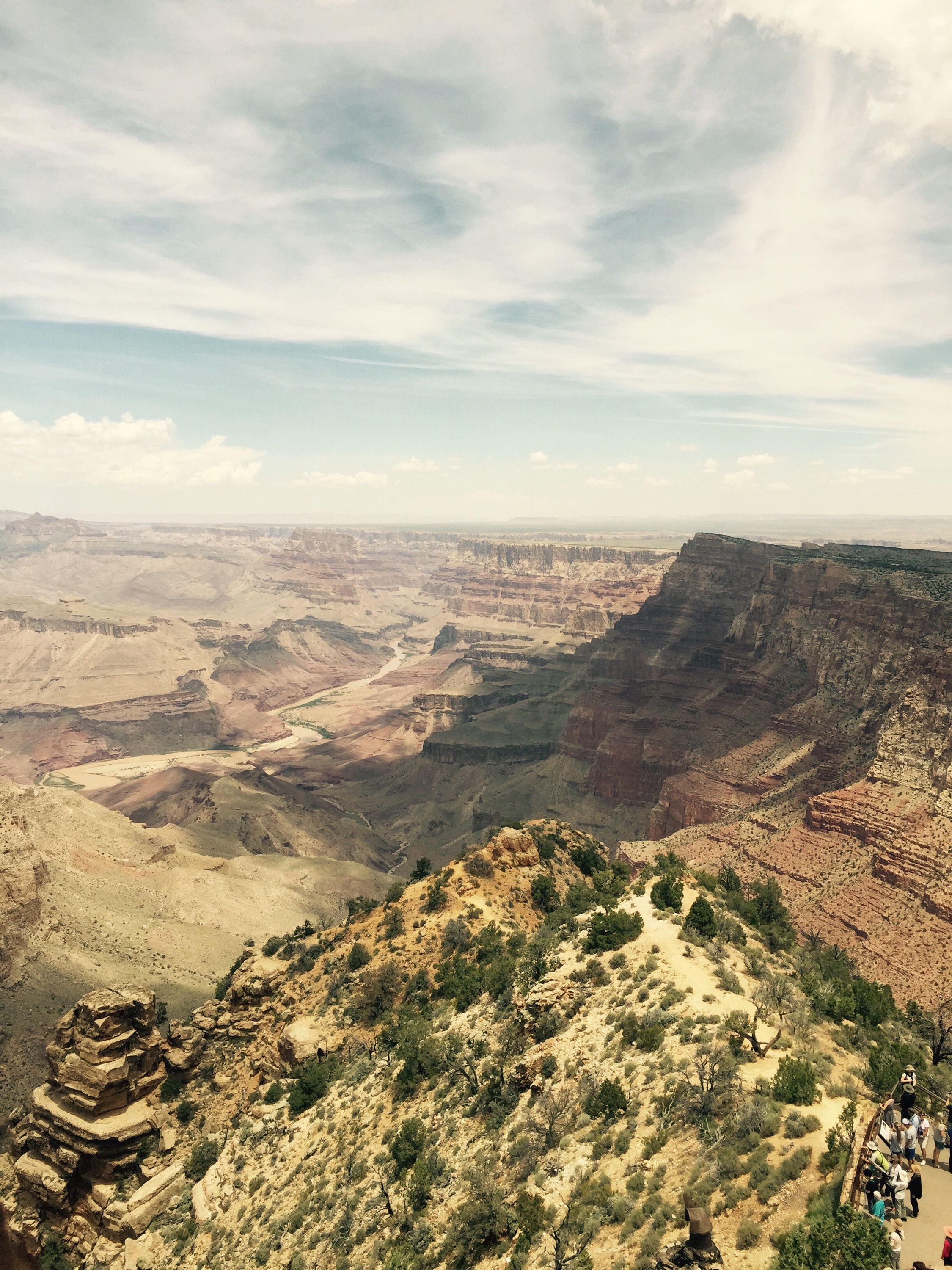 We continued on past various outlooks, each offering a unique and magnificent view of our surroundings. At the end of the desert view path is the east rim, and the watchtower. The watchtower is a massive stone tower, rebuilt sometime in the 20th century and turned into a viewing area. It was packed. A constant stream of tourists traveled in a slow line up 10 or so stories of stairs, usually at a pace set by somebody’s great grandmother as she eases her walker down them. The stairs were maybe 3 feet across at their widest point, and there were two streams of people constantly moving up and down them, one on each side. This caused great confusion and an uneliavable stench, as thousands of sweaty humans piled into what was essentially a massive stone oven with some windows at the top. That being said, the view made you forget all about it.