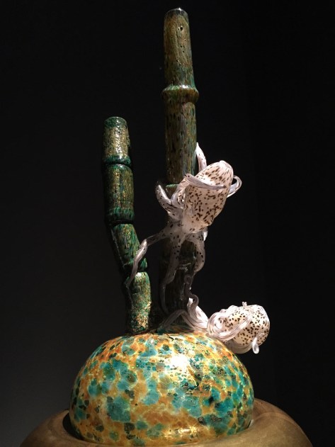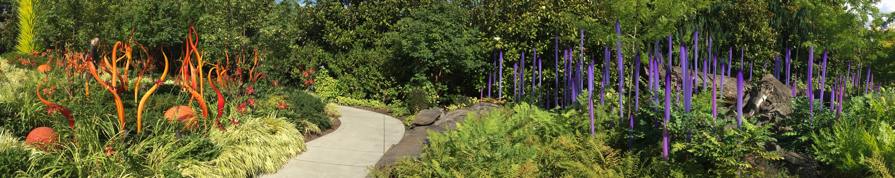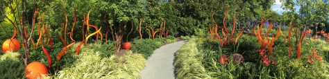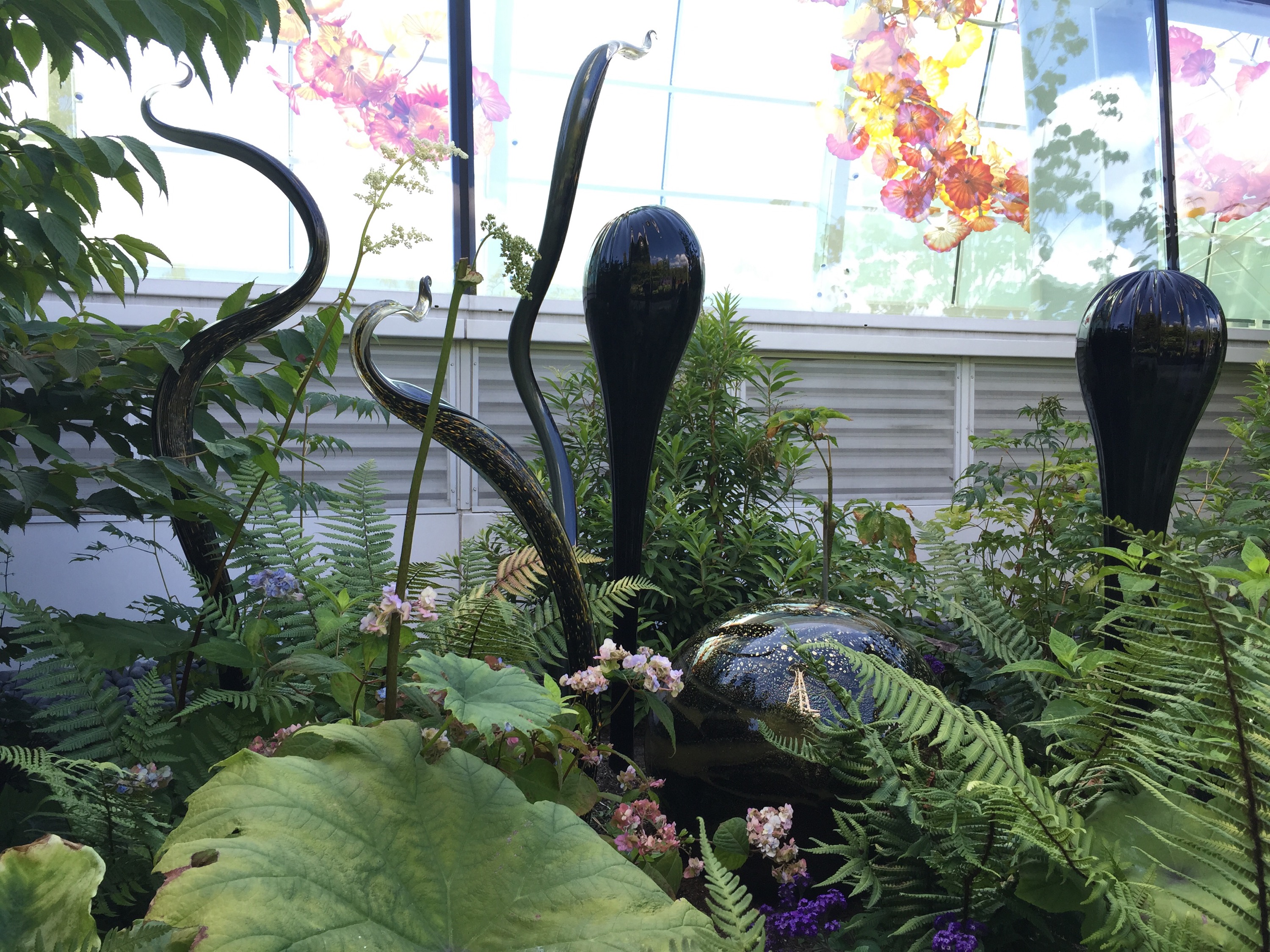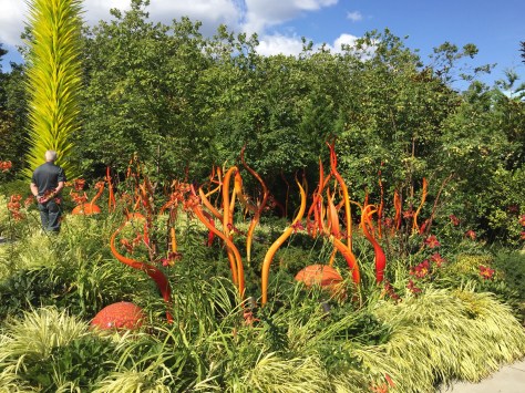 The gardens extend a ways past the greenhouse and around the tower, with clusters of glass works tucked away into little habitats all along the pathways. Occasionally the area opens up into a field of themed glass spires, placed questionably about amidst a wide variety of greenery. If you have a couple thousand dollars on hand, you can buy some original works in the shop there at the garden, but for the most part, this garden is the best available way to acquaint oneself with the otherworldly works of Dave Chihuly.