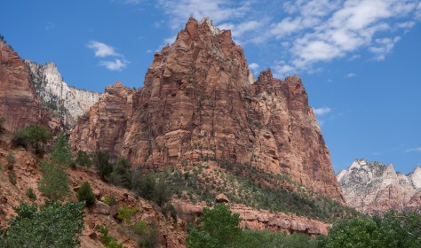 Like almost everything in Southern Utah, Zion is part of the Grand Staircase. Not the National Monument, but the geological formation, The Colorado Plateau. The Colorado Plateau is a one hundred and thirty thousand square mile blob, centered roughly on the four corners. During the Paleozoic era the plateau was inconsistently either a sea, or a dry sea. Every time the water retreated it left more and more sediment behind, and over the next three hundred million years, that sediment got compacted into miles and miles of sandstone. Skip waaaay ahead to the Cenozoic era (that’s the current one), about 20 million years ago. The entire area undergoes uplift at an angle which begins to tilt it unevenly as it leads north. The enormous steps of the Grand Staircase were thus formed, as the land rose more than ten thousand feet from where it was deposited. Rivers that used to be sitting on level ground, now found themselves raised to the peaks of mountains, and cut viciously to freedom down through the fractured sandstone. The rivers got stronger and gorges formed, floods occurred and massive landslides began to shape the canyon floors. Finally things began to settle down, and as the dust cleared the great canyons and peaks of the Colorado Plateau were revealed. Zion is the best of these. It’s something priceless buried in a pile of gold.