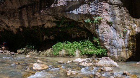 Brace yourself, because you’re about to get very wet. The trail ends where the river begins, and so you step into the ankle deep water, gazing at the canyon walls closing in all around you. The rocks are slippery and unstable, your attention is quickly diverted back to your feet as you try not to eat it in front of the couple hundred people enjoying the water at the mouth of the canyon. You make the first crossing and suddenly realize you’ve taken part of the river with you, your feet cocooned in a nice little bubble of water. The sensation goes from just weird to weirdly refreshing as you walk out of the water and back into the sun, brushing past a hanging garden as you stumble towards a patch of rapids. After about thirty minutes you’re in the river waist deep, wading up through the current as you try to navigate the maze of boulders hidden below the water. At this point using the hiking stick is second nature, brushing it along the rocks to find a suitable anchor point for each step, whipping it around as you try to stabilize yourself against the furious white water created by a stray boulder.