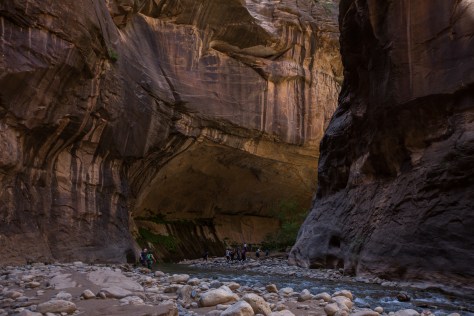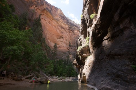 The Narrows. Over twenty miles of the most magnificent slot canyons in the world, winding through the path cut by the Virgin River as it sliced through Zion. The Virgin River actually still flows through the Narrows, which is the primary reason this will be one of the most unforgettable hikes of your life. To get there get off the bus at stop nine, then hike about a mile down the trail until it just sort of… stops, and turns into a river. If you decide to hike the Narrows, check out the Zion Outfitter which is just outside the visitor center area. They rent canyoneering shoes, neoprene socks, and hiking sticks to anyone wishing to hike the river, and I highly recommend you get them. A hiking stick is absolutely crucial for this hike, if you have your own bring it, if not, rent one. The canyoneering shoes and socks aren’t necessary, but are really nice to have if you don’t want to water log and potentially destroy your street shoes. So, once you’re geared up head to stop nine, hike a mile, ok, you’ve hit the river, what now?