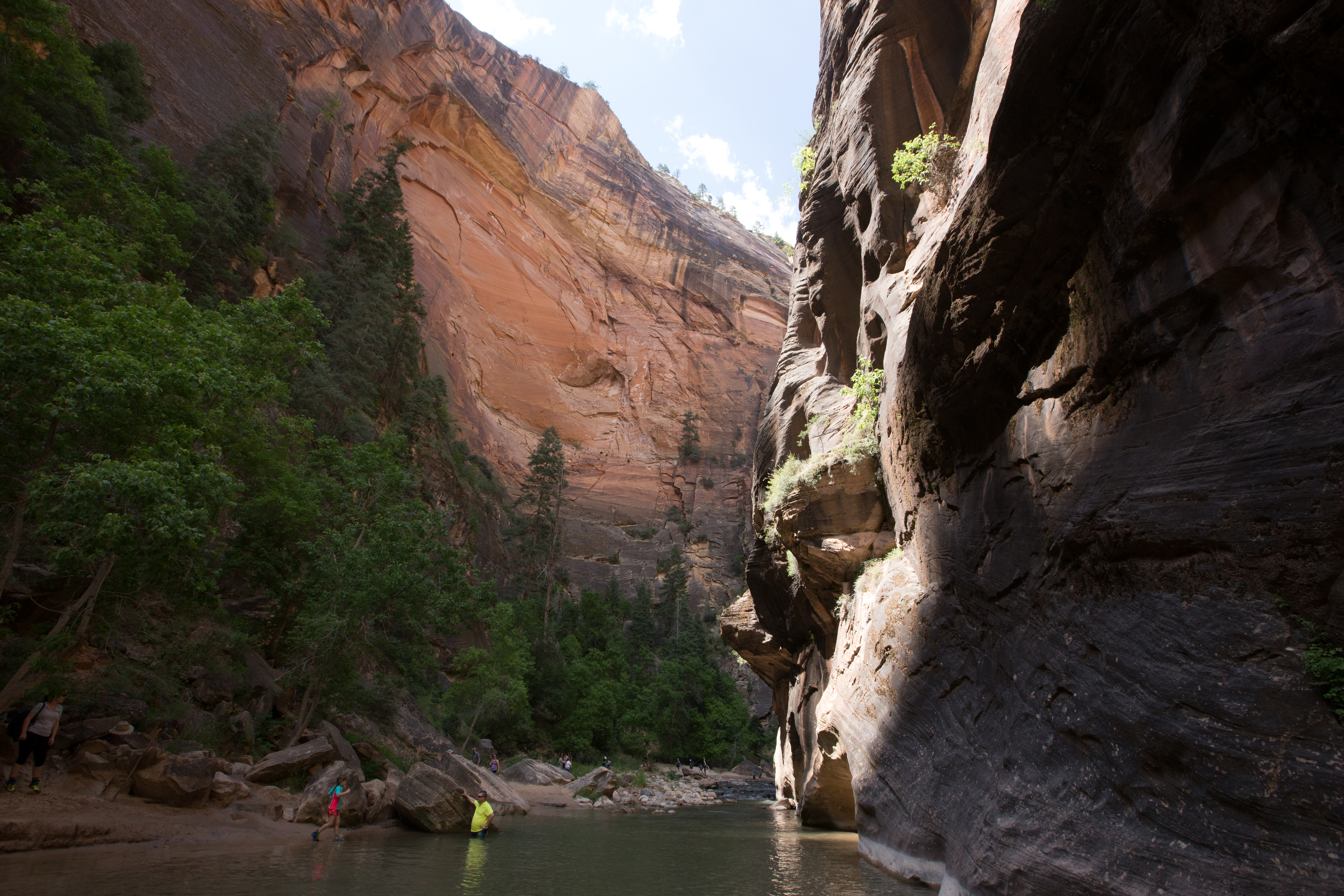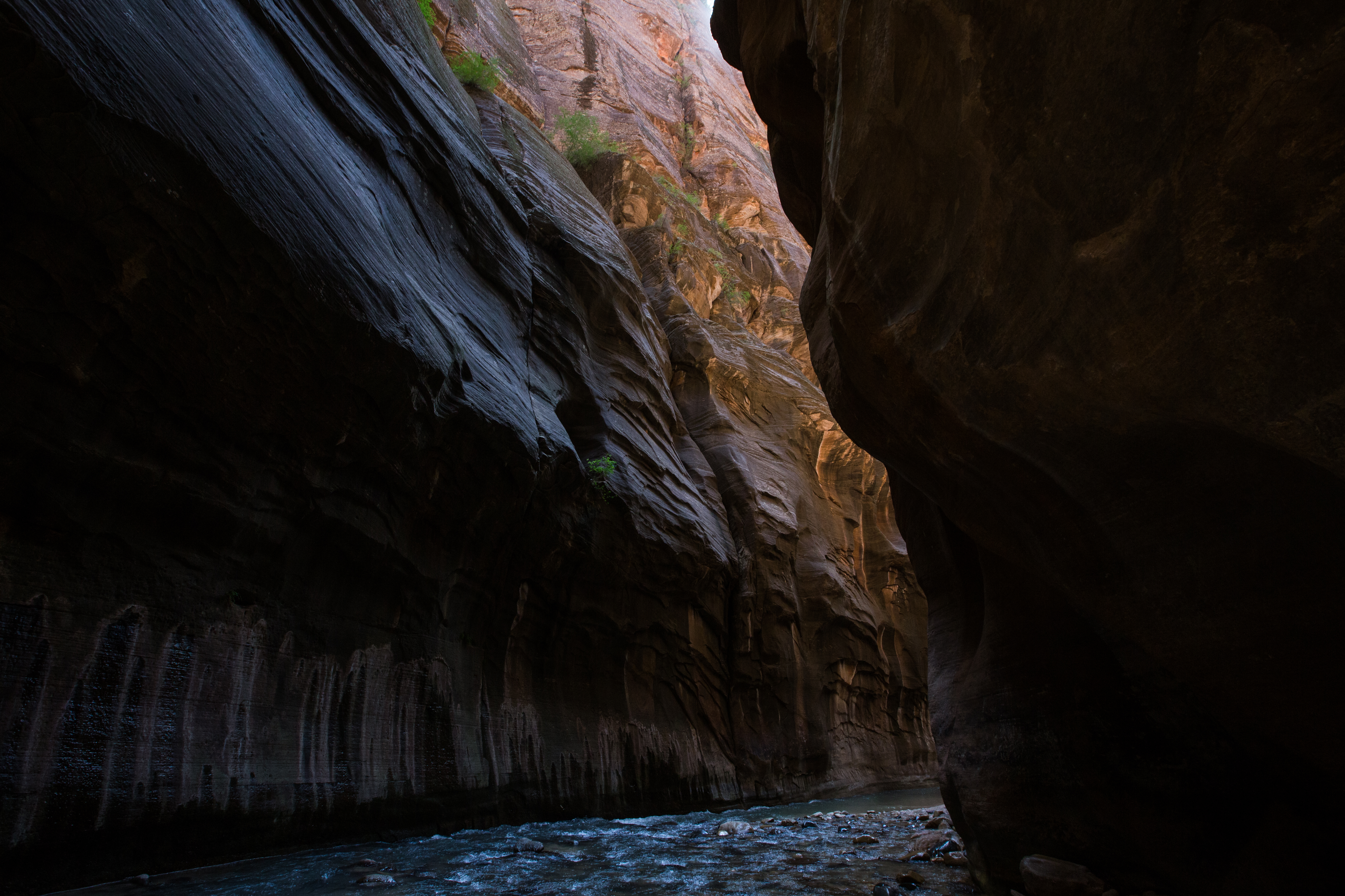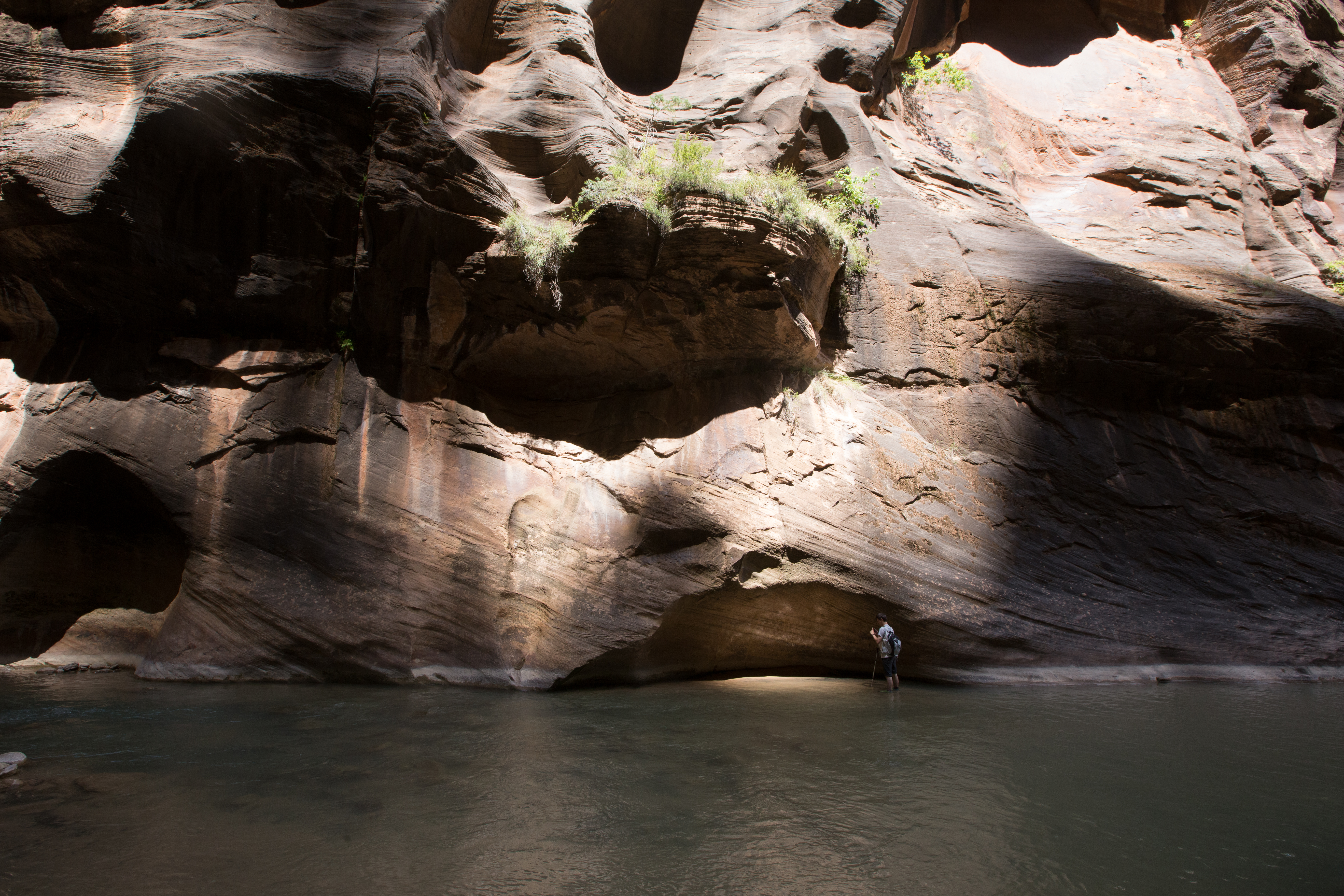 Brace yourself, because you’re about to get very wet. The trail ends where the river begins, and so you step into the ankle deep water, gazing at the canyon walls closing in all around you. The rocks are slippery and unstable, your attention is quickly diverted back to your feet as you try not to eat it in front of the couple hundred people enjoying the water at the mouth of the canyon. You make the first crossing and suddenly realize you’ve taken part of the river with you, your feet cocooned in a nice little bubble of water. The sensation goes from just weird to weirdly refreshing as you walk out of the water and back into the sun, brushing past a hanging garden as you stumble towards a patch of rapids. After about thirty minutes you’re in the river waist deep, wading up through the current as you try to navigate the maze of boulders hidden below the water. At this point using the hiking stick is second nature, brushing it along the rocks to find a suitable anchor point for each step, whipping it around as you try to stabilize yourself against the furious white water created by a stray boulder.