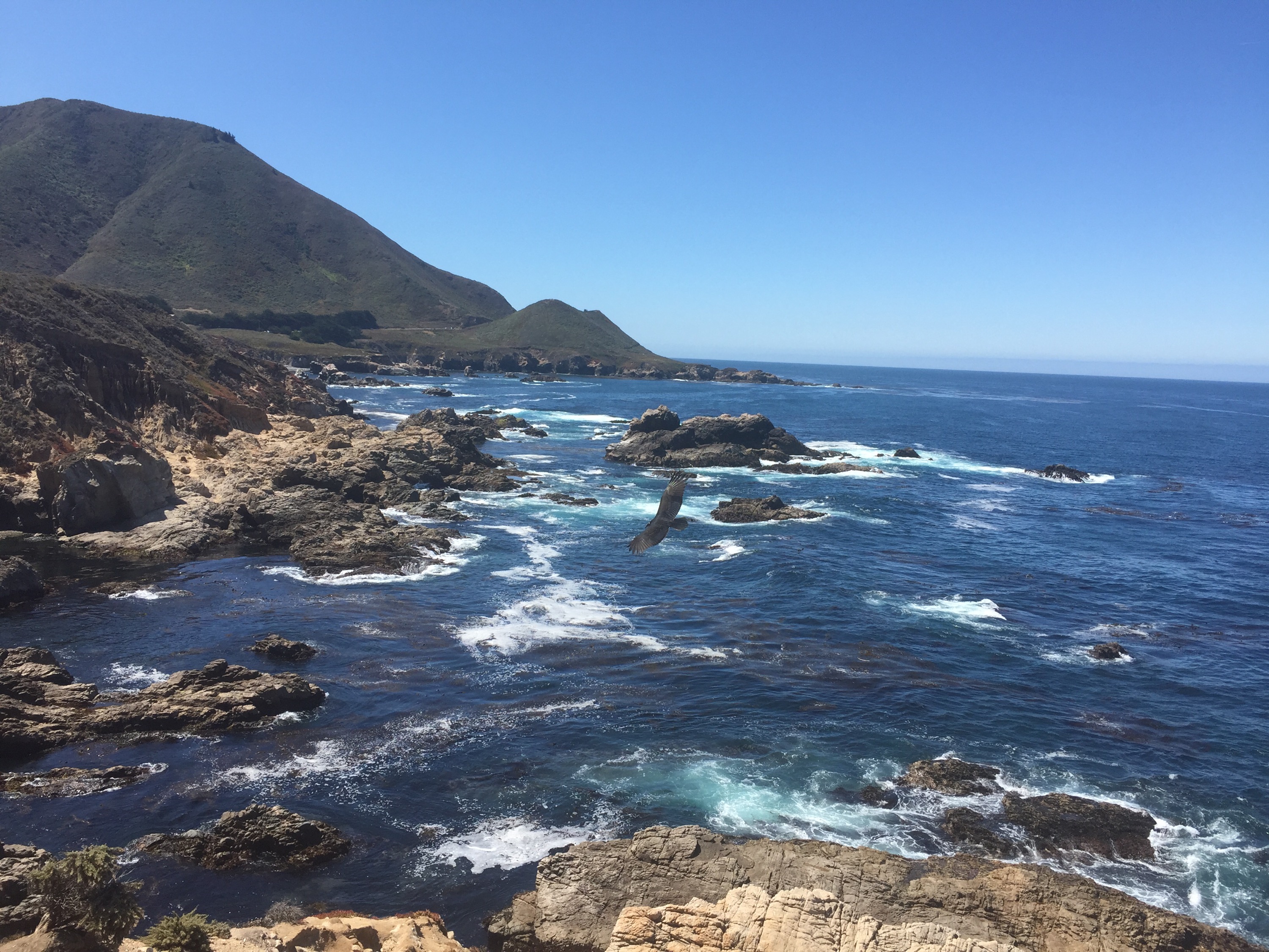 We’re just now heading to San Francisco, after traveling highway one along to Monterey. The late post is due to the lack of service as you travel between the Pacific and the Santa Monica mountains, essentially a 40 mile stretch of dead zone. The loss of LTE is hardly missed however as the coast is everything it’s hyped to be. The evidence of the ocean’s raw power is everywhere, the remnants of its destructive crusade against the coast seen as the battered shoreline of central California. A staggering amount of spires, caves, and pools populate the area, which can change from a sheer 150 foot drop to a gentle sloping beach in just a few minutes. The rocks were not only magnificent in construction, but also strikingly colorful. Kelp pools created areas of water painted a shade of deep red, contrasted by neon blue shallows and the kind of moss coverage that you always imagined would make an incredible bed. As I ventured out onto the rocks, a condor decided to ride the wind directly in front of, and subsequently right over me. 100% worth the stop, but get there earlier than ten a.m. or plan to come back tomorrow, because parking will be completely and totally nonexistent.
