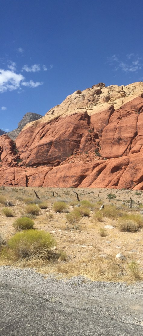 As we cruised into Vegas, we decided to check out Red Rock Canyon, a well renowned park on the east side of the city. The first thing we noticed is how quickly the city disappeared, one minute we were driving through lush palms and suburbs, the next all we could see in every direction was desert. The canyon itself was semi hidden behind some spectacular mountains, just a glimpse of brilliant red over the tops of hills as you get closer and closer. When you finally do make it to the visitor center, a clean and modern haven of tourist info and air conditioning, you will see a completely alien stretch of rock jutting out of the ground through a massive window-wall that wouldn’t be out of place on a star destroyer.